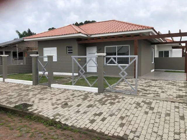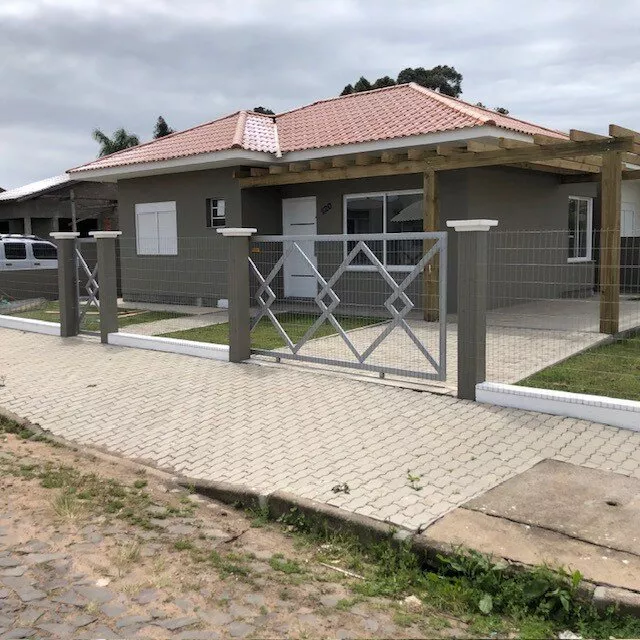 CASA DE ALVENARIA, com área de 73m² + PERGOLADO com 02 dormitórios, sendo 01 suíte com sala de jantar e estar. Aberturas em alumínio, pátio fechado, e pergolado sem cobertura.