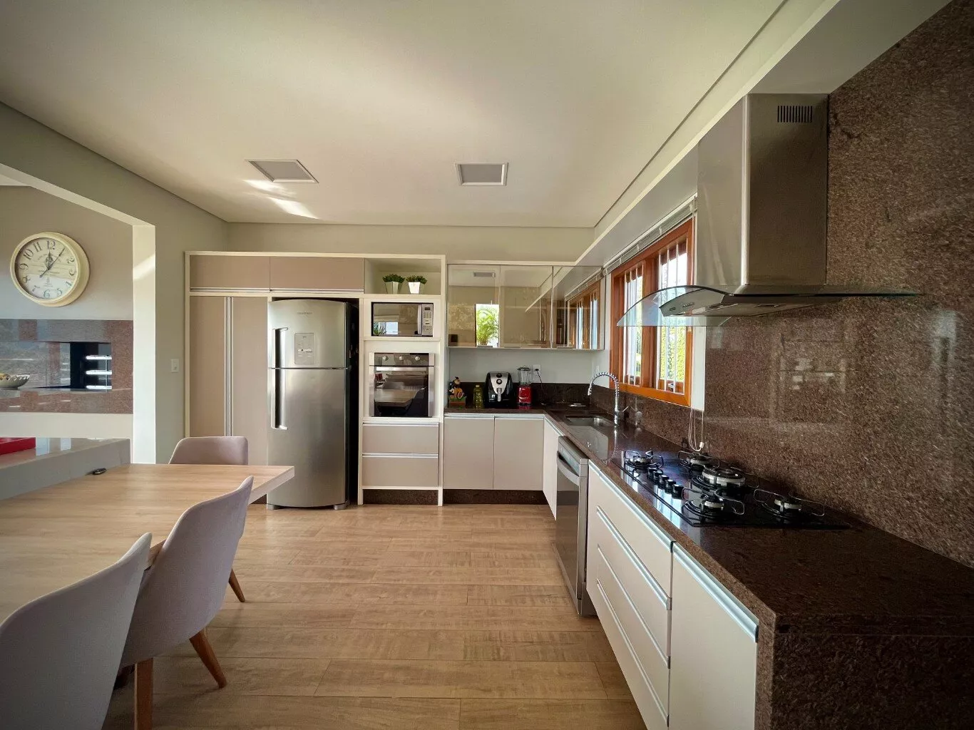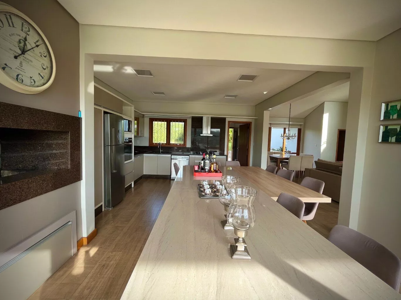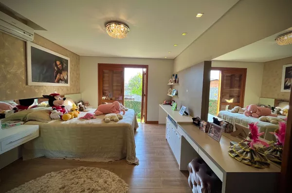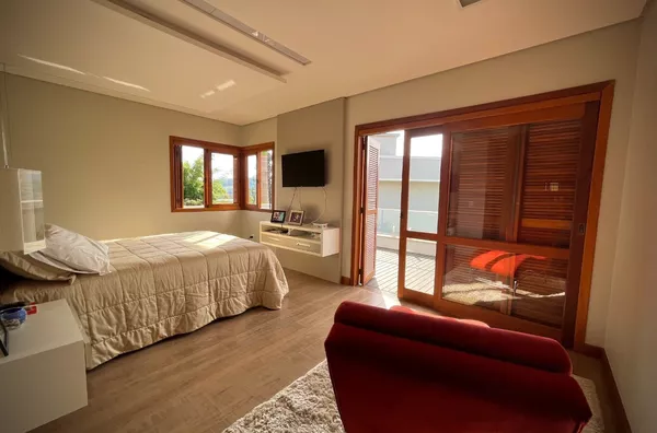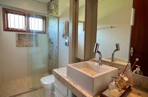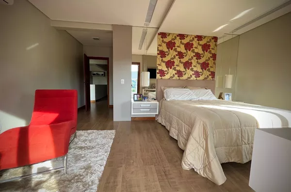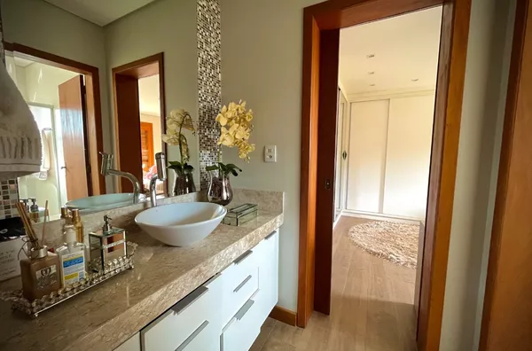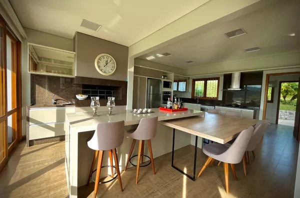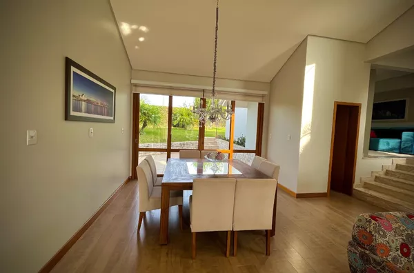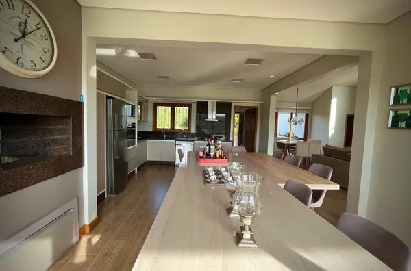 Excelente casa de alvenaria, com área construída de 295,12m², distribuídos em 03 dormitórios, sendo uma suíte com closet e hidro, total de 03 banheiros de fino acabamento, sala e cozinha em conceito aberto formando um amplo ambiente com lareira e sacada integrada com linda vista panorâmica, churrasqueira, aberturas em pvc, aquecimento a gás nos banheiros e cozinha, revestimentos em porcelanato, com designer interno glamouroso e funcional, garagem para 02 carros estacionados lateralmente, depósito, escadas internas em granito, totalmente mobiliada em ótimo padrão, edificada sobre um terreno com a área 1.244,00m², ornamentado com lindo jardim, incorporado ao conjunto de verde e a tranquilidade do local, estando ao lado de excelente estrutura de laser que proporciona conforto e comodidade com baixo custo.