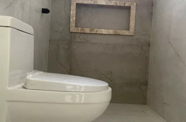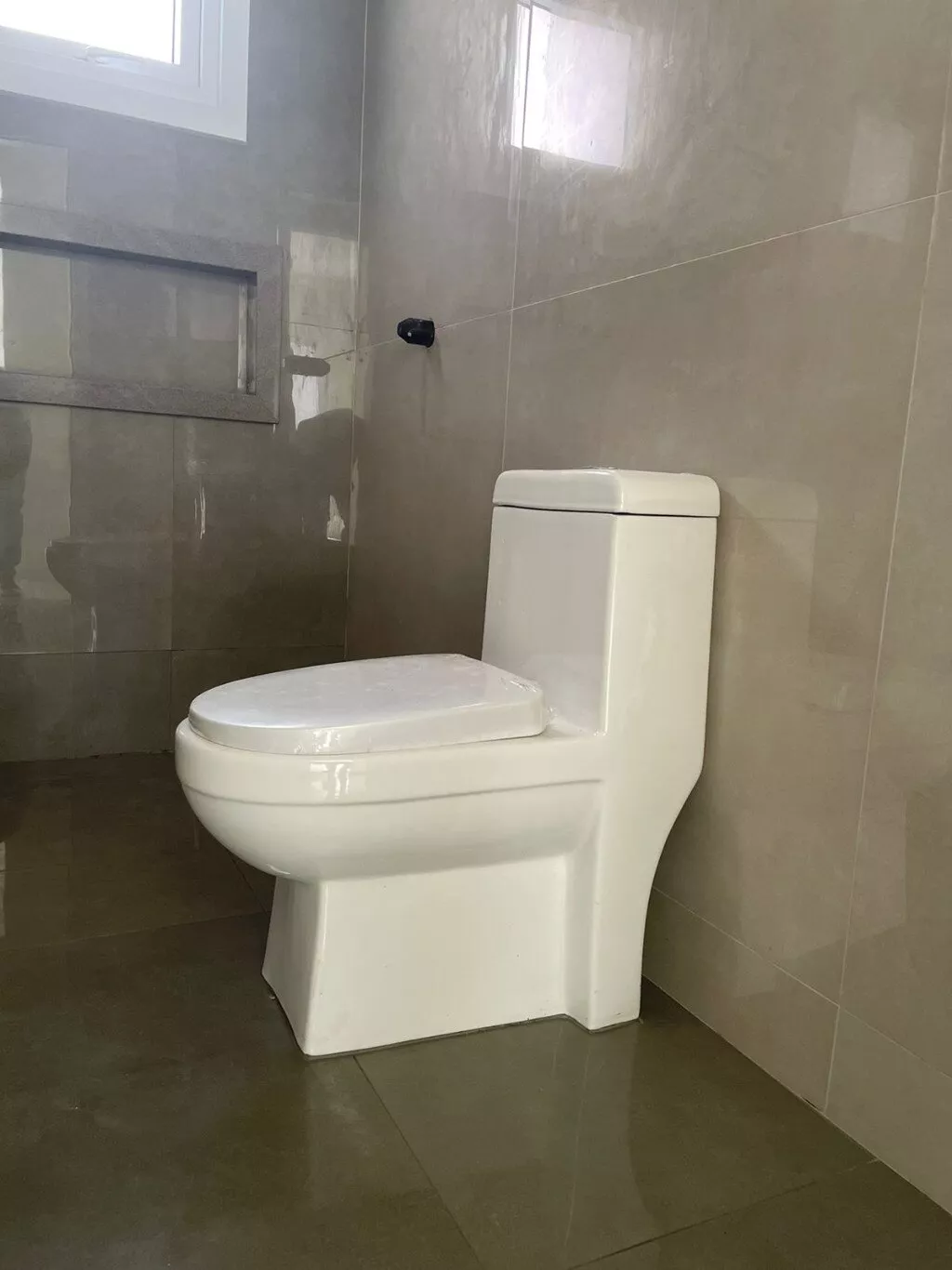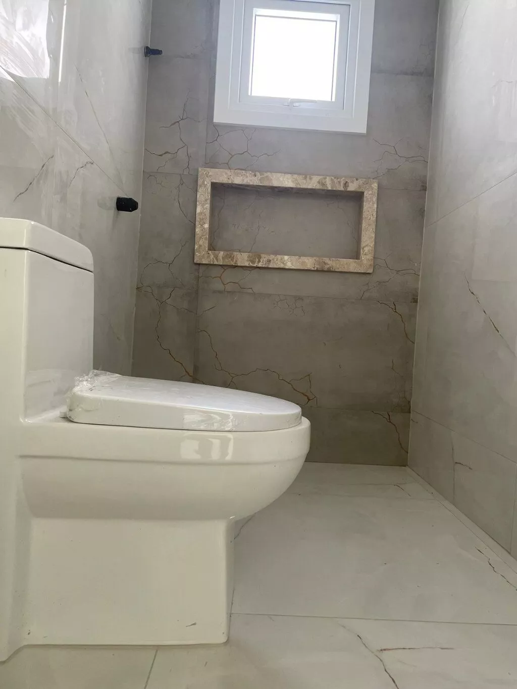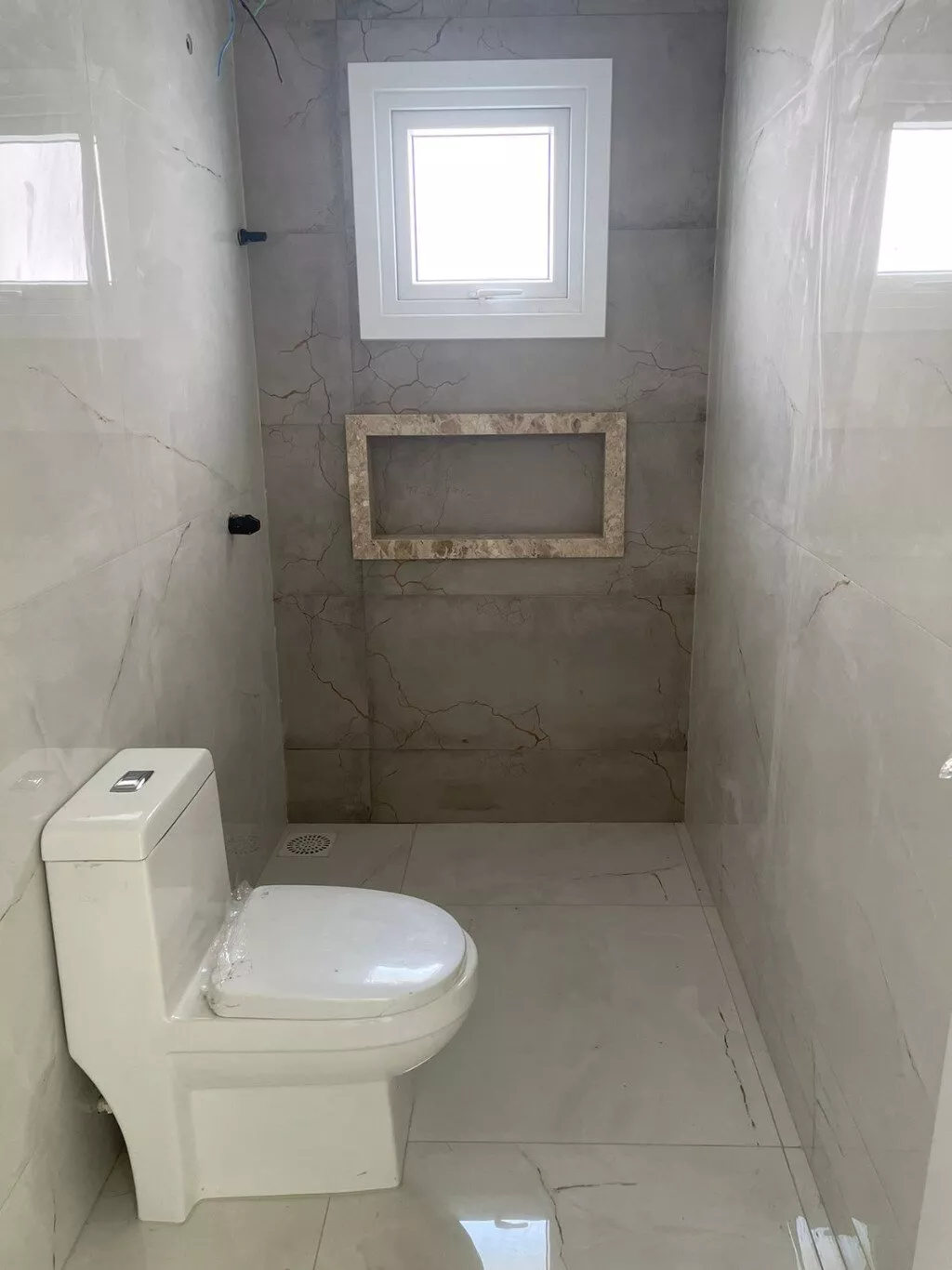 - Banheiro social centralizado: Design moderno e revestimento de destaque para um toque especial.