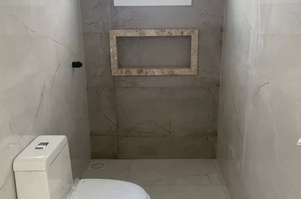 - Suíte master com banheiro privativo lindamente revestido, proporcionando relaxamento e privacidade.