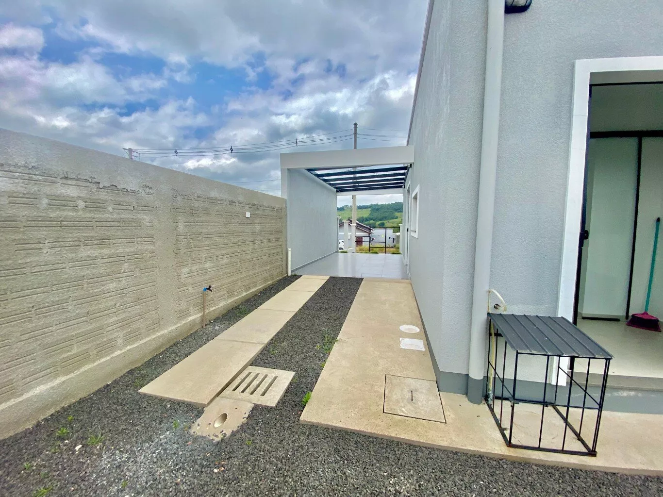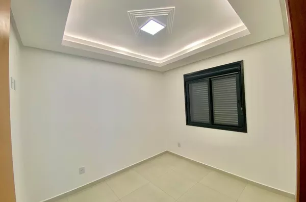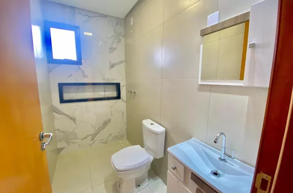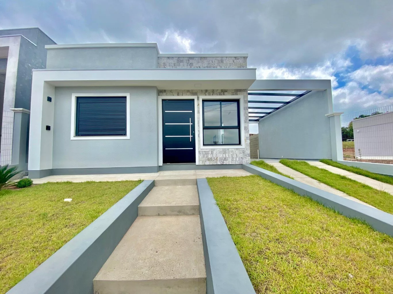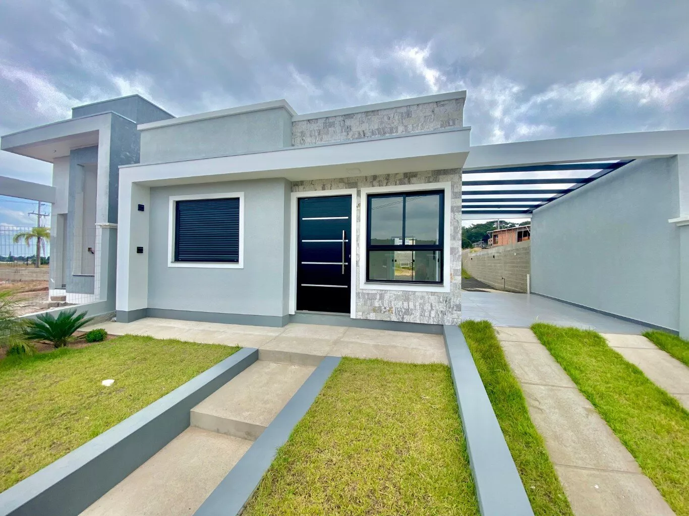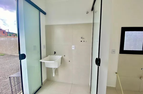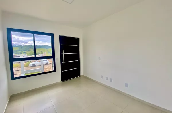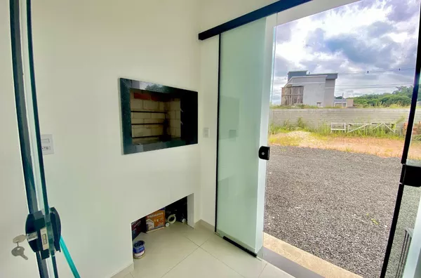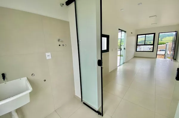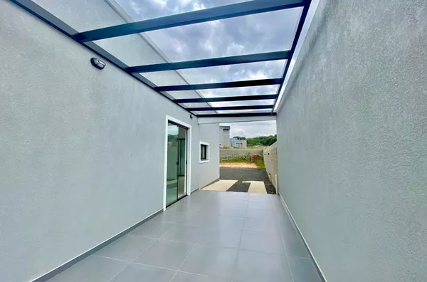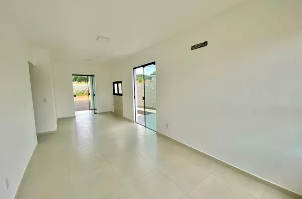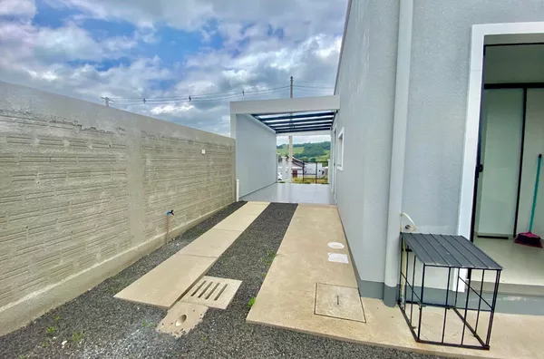 Imóvel possui sala e cozinha integradas, lavanderia interna, churrasqueira, 2 dormitórios sendo 1 suíte, pergolado para 1 carro, teto em laje com acabamento em gesso, piso em porcelanato, aberturas externas em pvc na cor preta, pátio todo fechado com estrutura para garagem nos fundos.