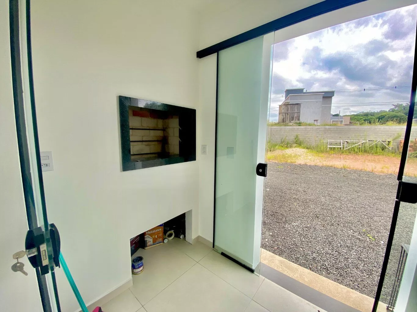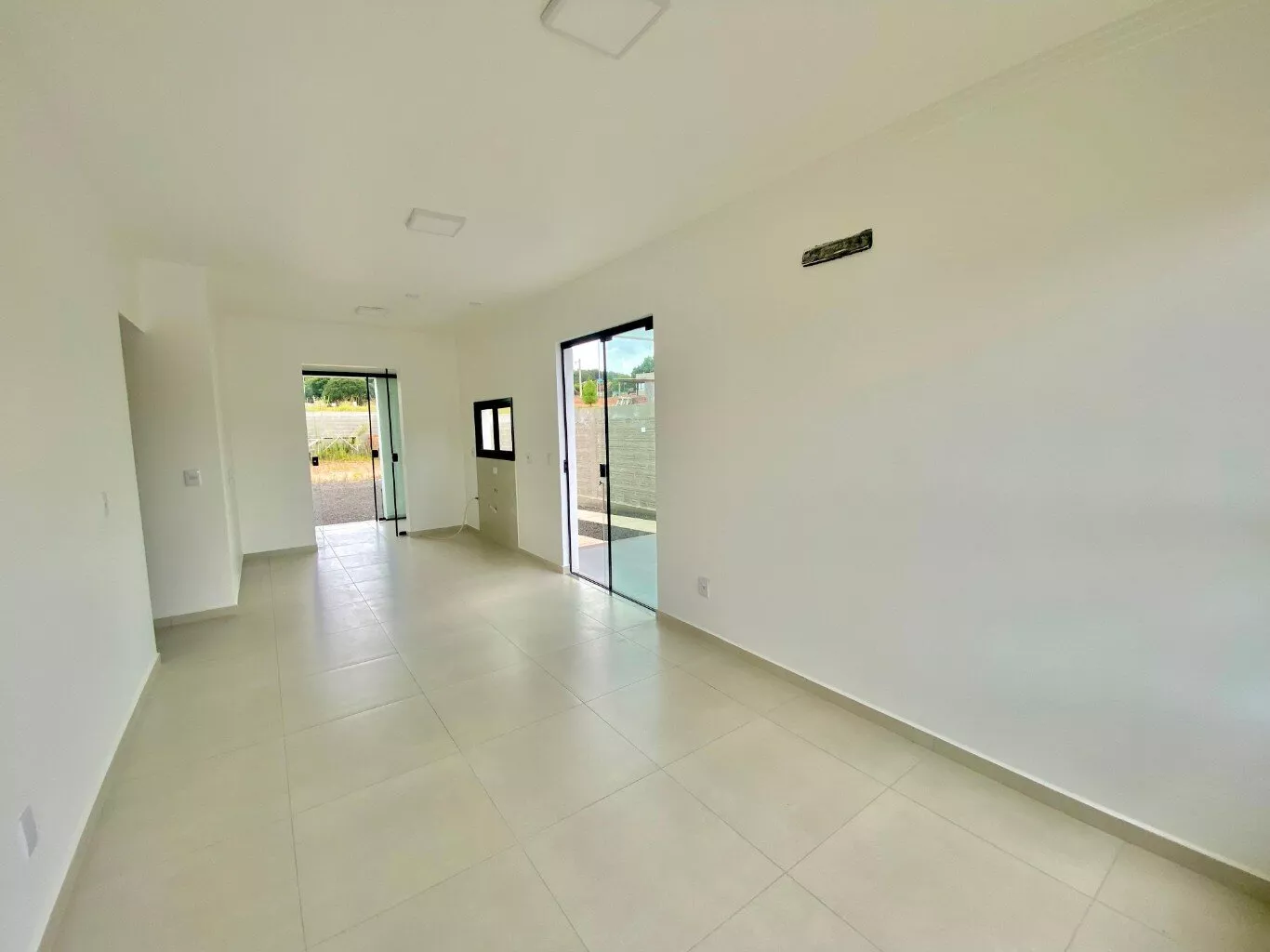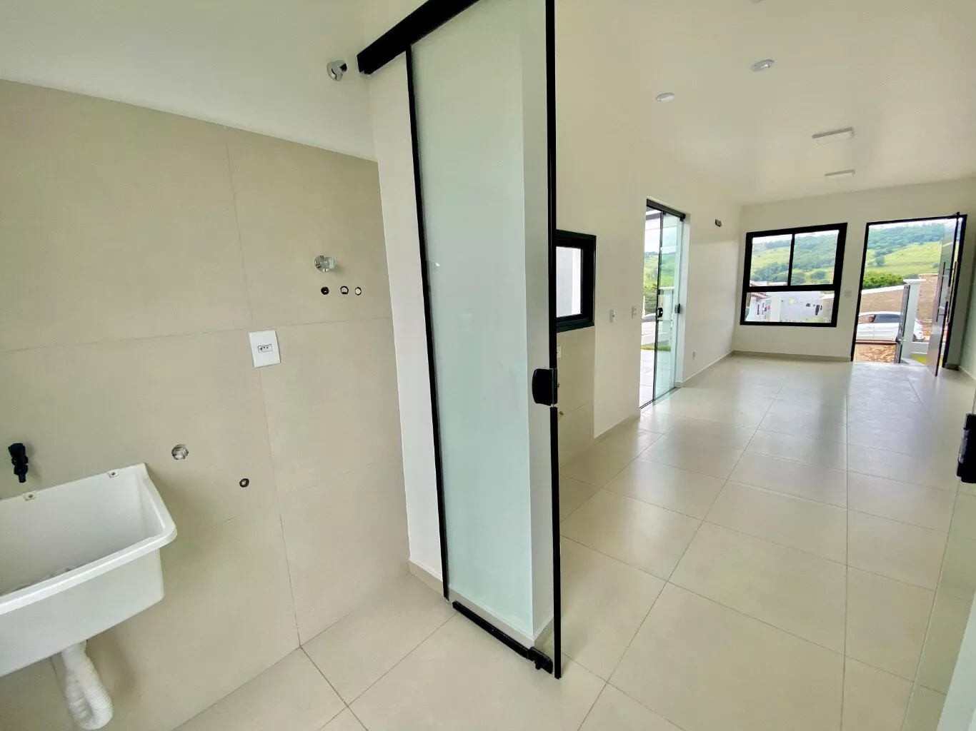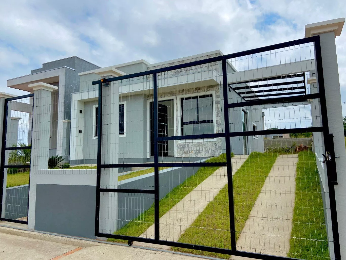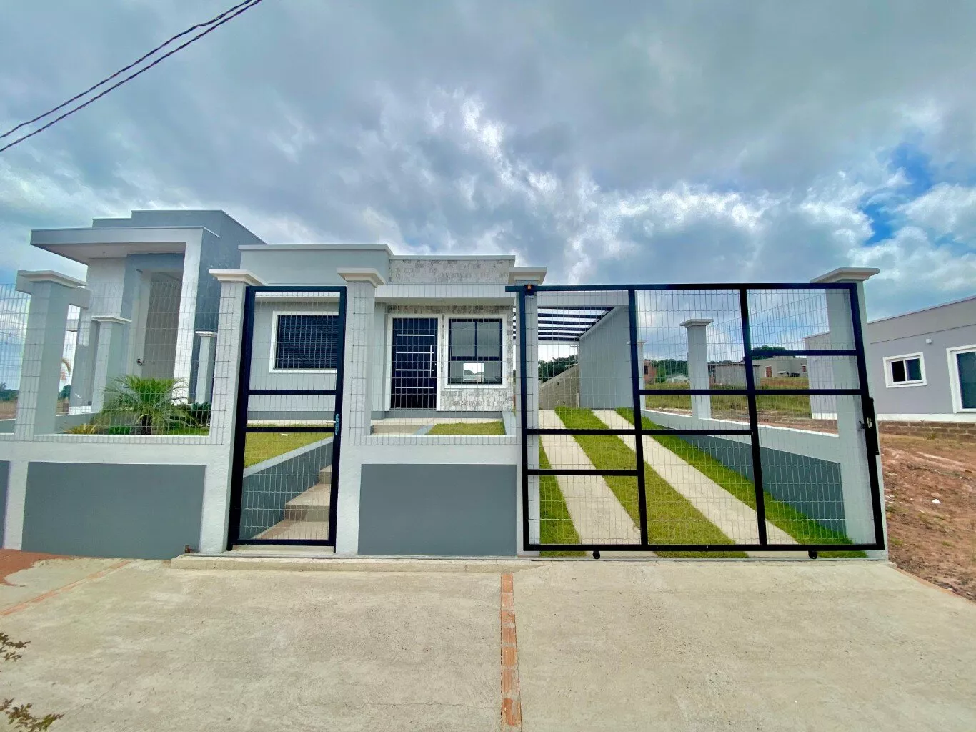 Imóvel possui sala e cozinha integradas, lavanderia interna, churrasqueira, 2 dormitórios sendo 1 suíte, pergolado para 1 carro, teto em laje com acabamento em gesso, piso em porcelanato, aberturas externas em pvc na cor preta, pátio todo fechado com estrutura para garagem nos fundos.