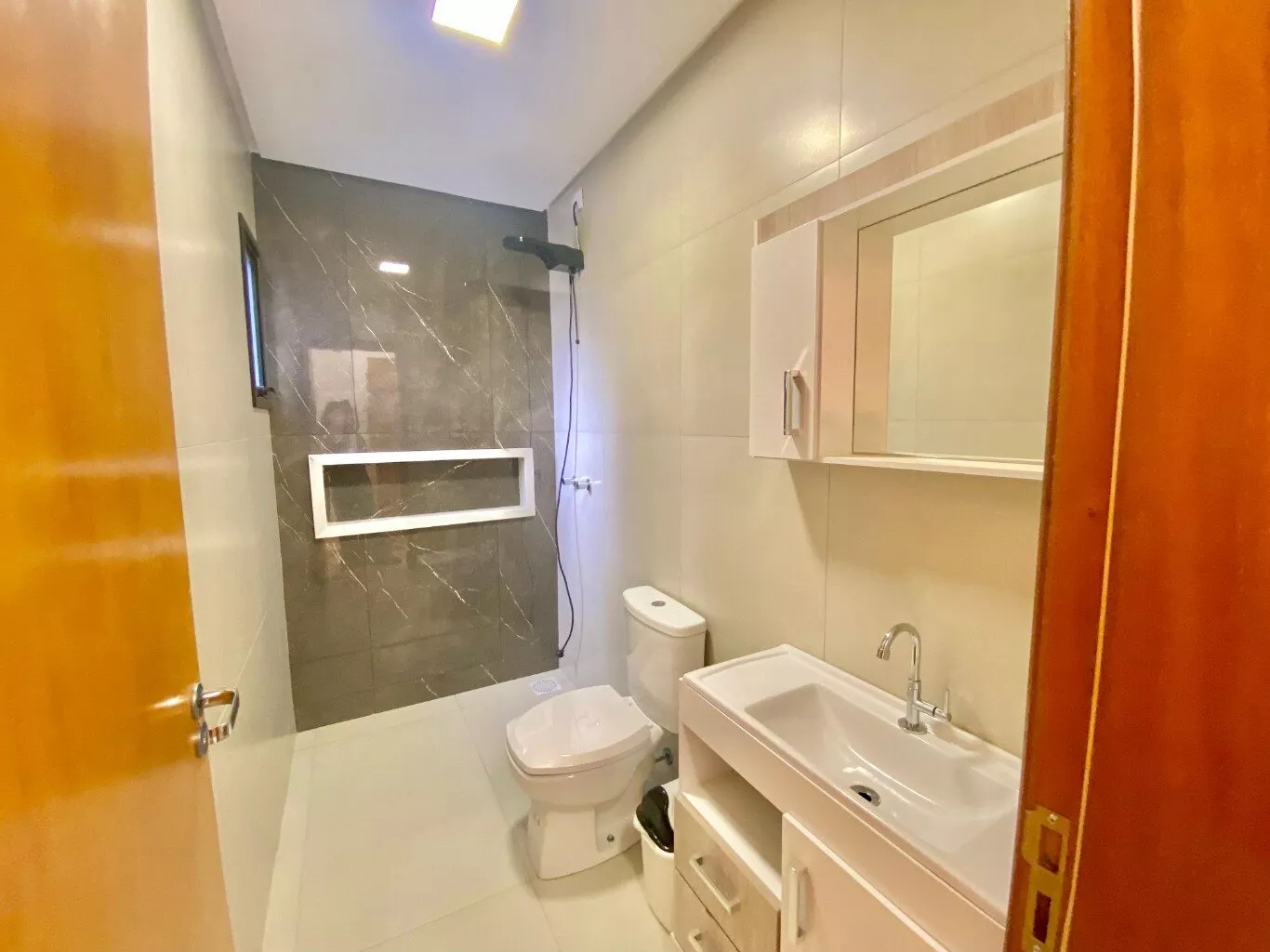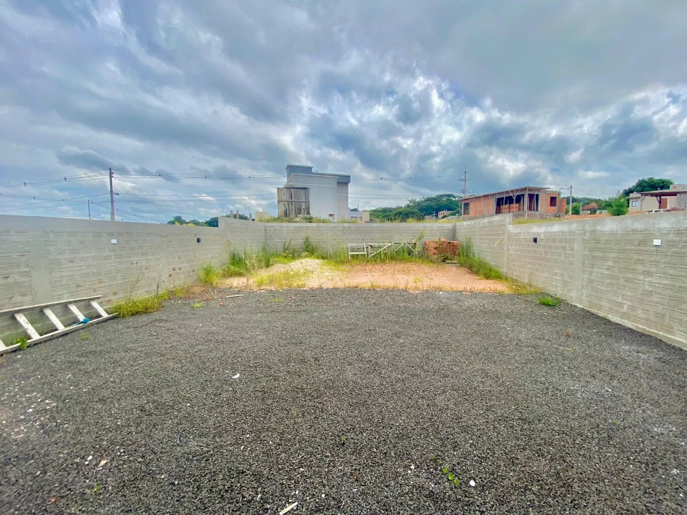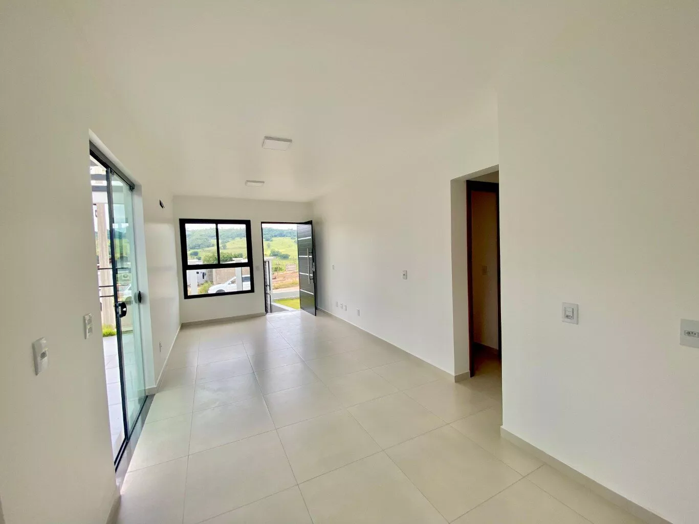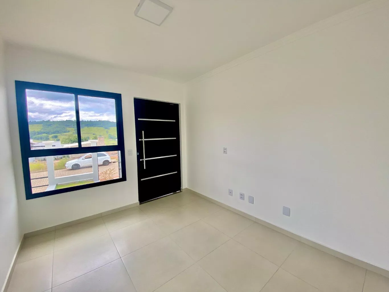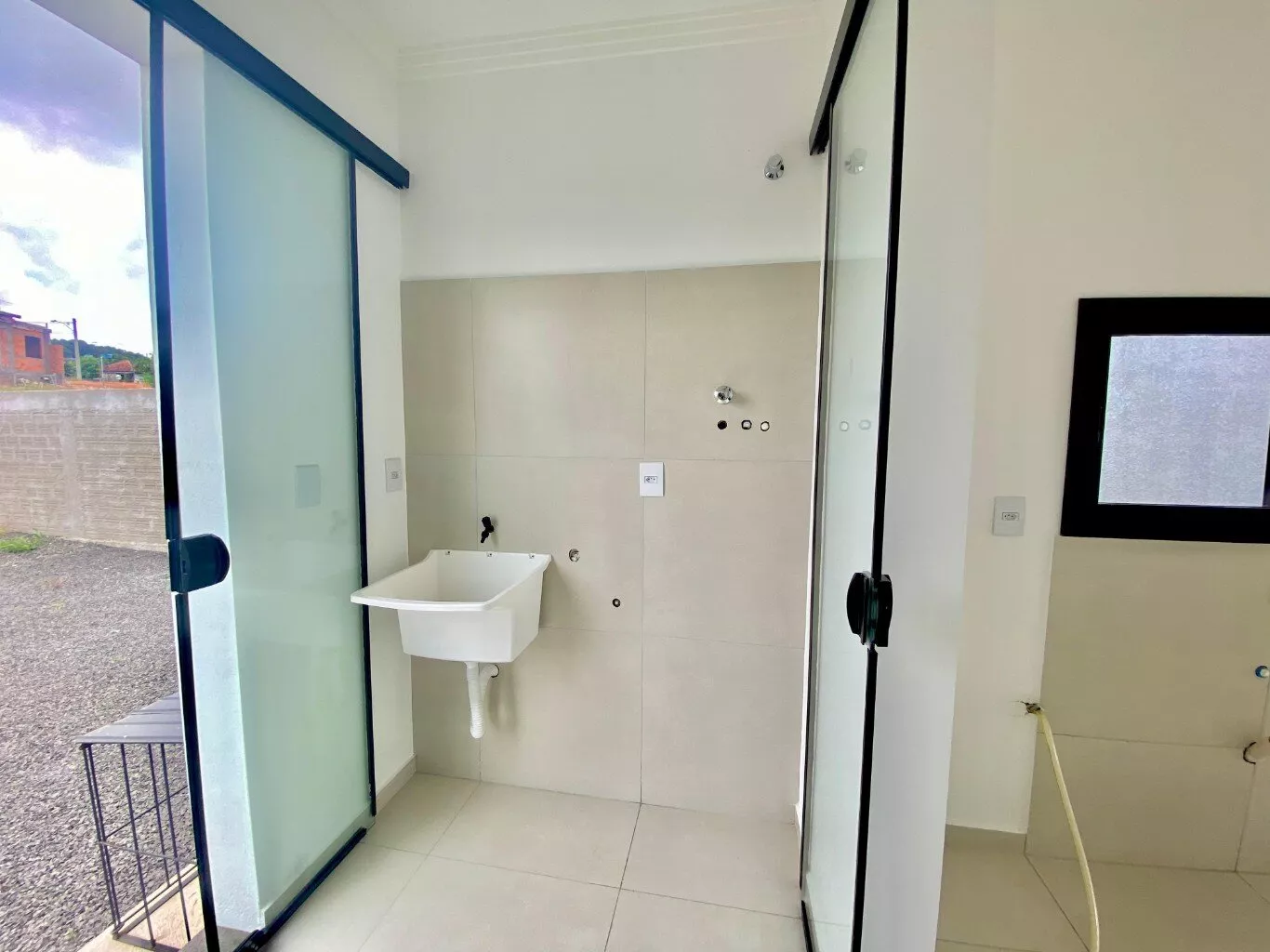 Imóvel possui sala e cozinha integradas, lavanderia interna, churrasqueira, 2 dormitórios sendo 1 suíte, pergolado para 1 carro, teto em laje com acabamento em gesso, piso em porcelanato, aberturas externas em pvc na cor preta, pátio todo fechado com estrutura para garagem nos fundos.