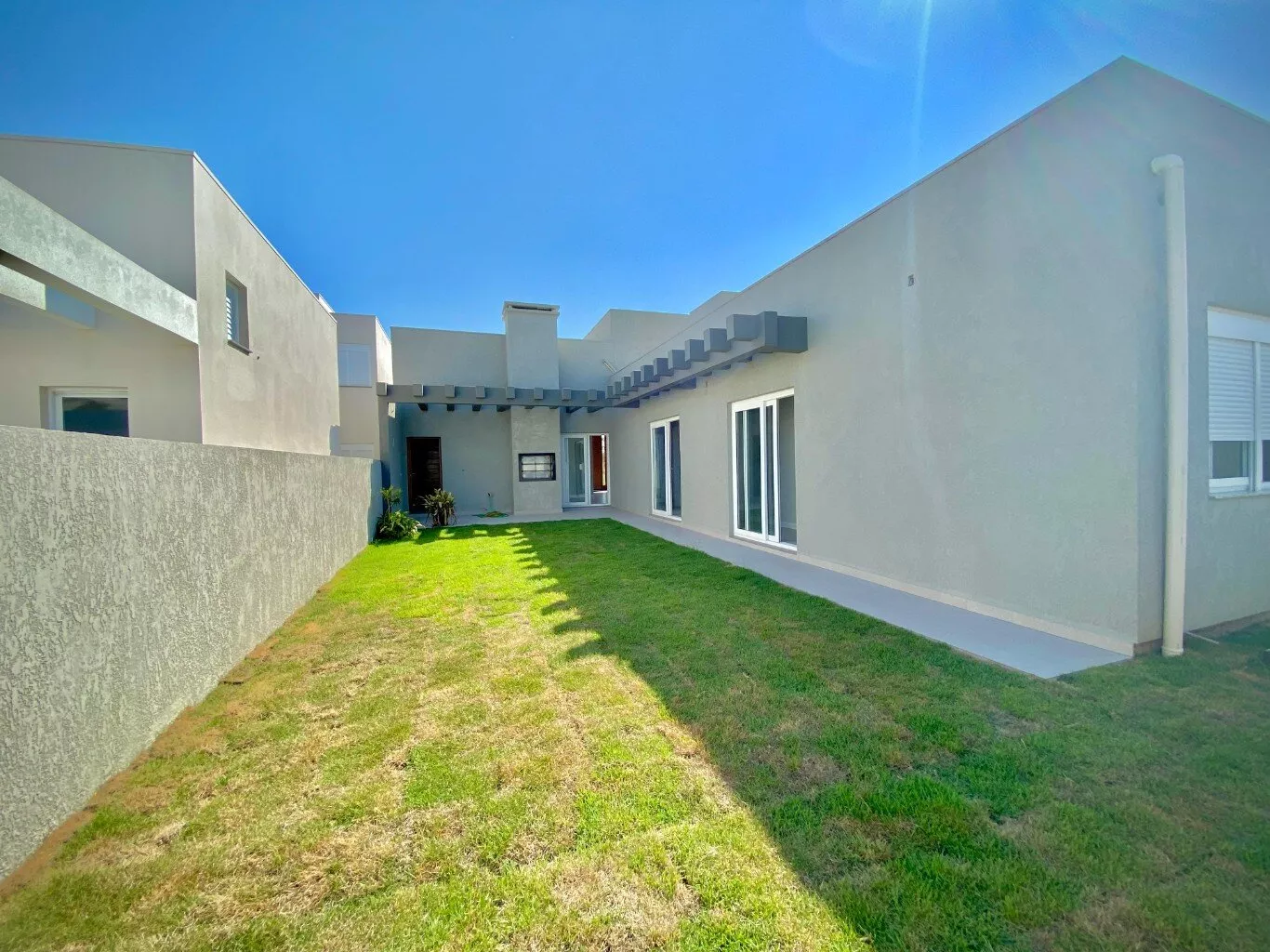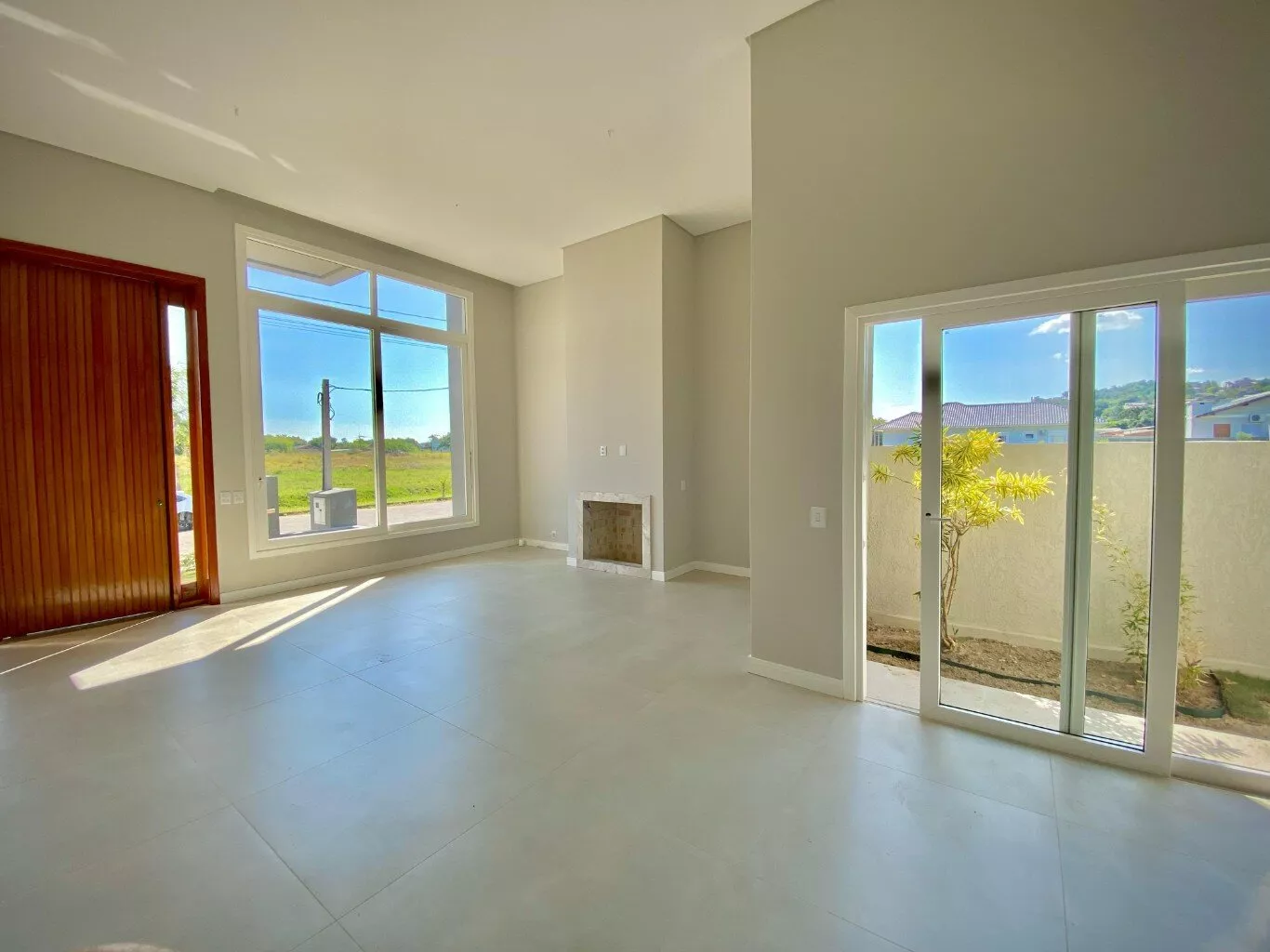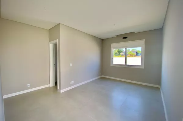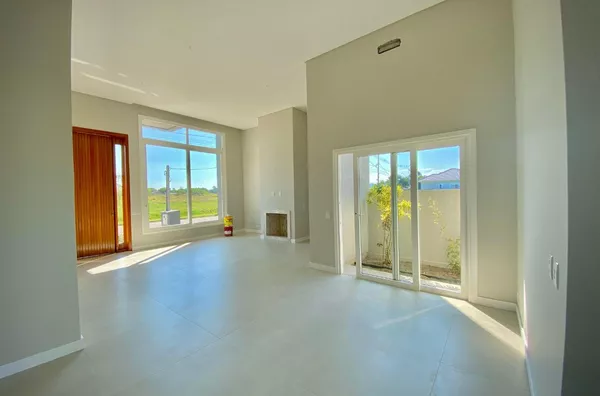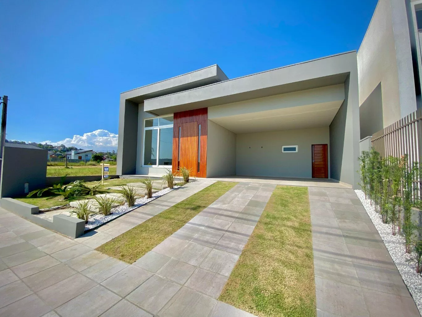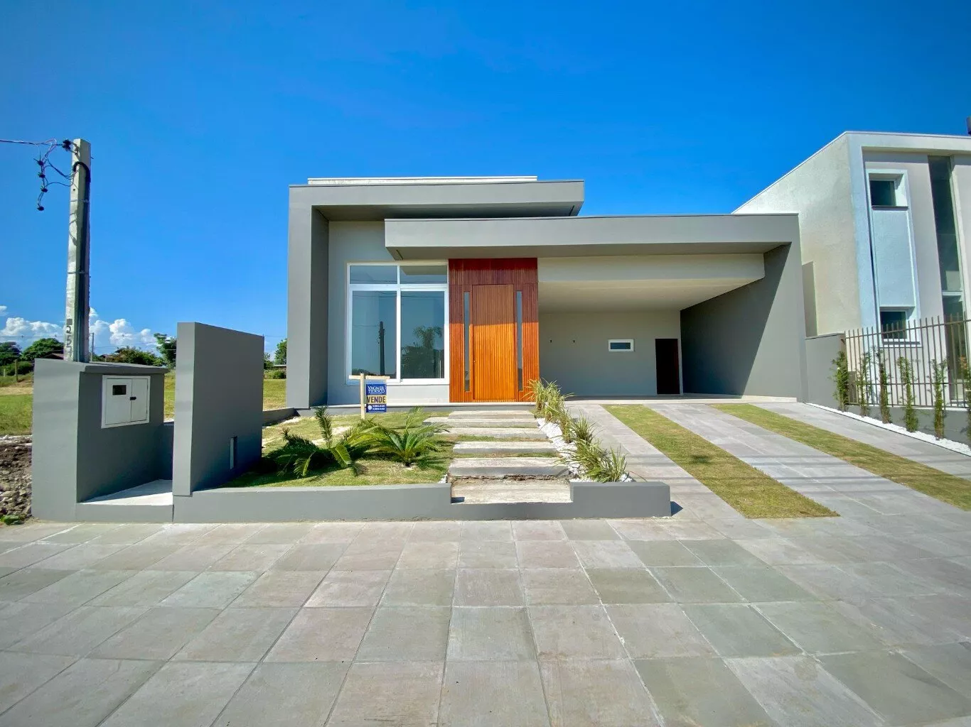 Casa de alvenaria nova, alto padrão, arquitetura moderna, com área privativa de 151,00m², com 03 dormitórios, sendo 01 suíte, banheiro americano, cozinha, jantar e estar integrados, lareira, lavanderia, lavabo e área com churrasqueira; Garagem para 02 carros (lado a lado); aberturas em PVC, piso porcelanato, teto com rebaixo de gesso; Terreno medindo 360,00m²; Pátio com calçada e jardinagem, cercado com portão e muros de vidro.